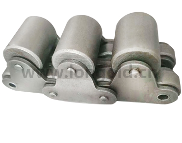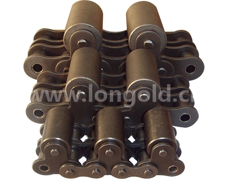 將雙排雙倍節距鏈的鏈板向上伸長,在伸長部分安裝可自由滾動的頂置滾子的自由流動鏈。 鏈條本體為鋼制2列雙節距鏈條。