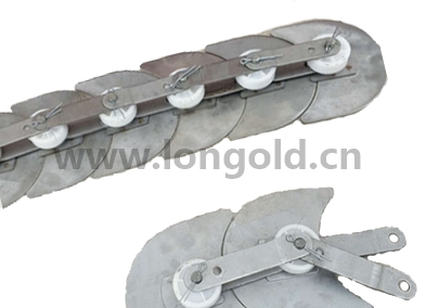 本體鏈條為雙節距帶大滾子輸送鏈條,鏈條上附月牙形狀的附件。主要做水平面的循環輸送用。在回轉壽司等輸送場合有這個廣泛的應用。產品結構簡單,安裝替換方便,更換維護成本低。
