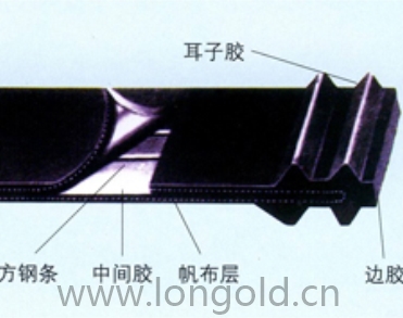 ◎ 沿膠帶橫向鋪設方鋼條,其間以橡膠填充,用膠布包覆成為帶芯,并覆蓋上、下覆蓋層,在由此構成的帶體兩邊設置耳膠,邊膠。