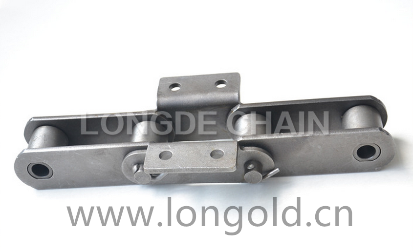此種輸送鏈,是由雙節距鏈條衍生而來的。其鏈條結構包括:內外鏈板、套筒、滾子、銷子。鏈條節距為非常用規格,裝配類似A1/A2或K1/K2的附件,用于物料的輸送。