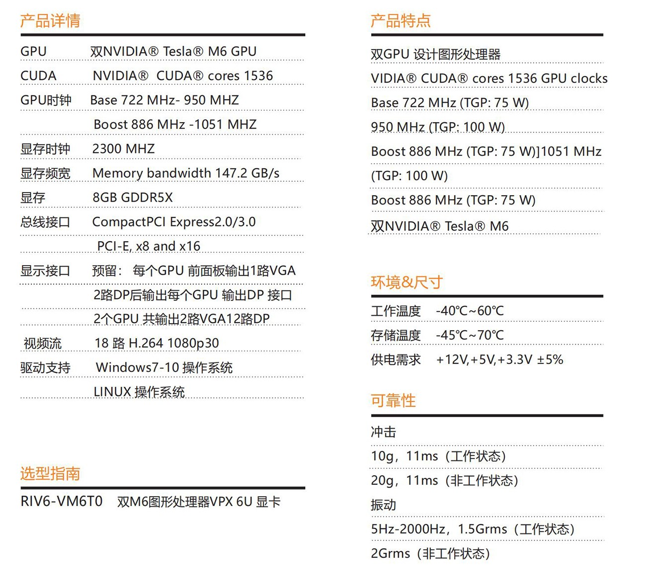 一款高性能雙GPU VPX結構獨立顯卡,采用二個NVIDIA? Tesla?M6 圖 形 加 速 器 芯 片 設 計 , NVIDIA? Tesla? M6 GPU Memory clock 2300 MHz為256BiT8GB GDDR5顯存 ;具有出色多顯示輸出接口、NVIDIA? Tesla? M6 GPU 加 速器針對刀片式服務器進行了優化,能為數據中心的虛擬工作站、桌 面和應用程序提供高性能圖形。該加速器與 NVIDIA GRID? 軟件 無縫地配合工作 ,可使企業虛擬化包括專業圖形應用程序在內的眾多 應用程序,并將這些應用程序傳輸到設備中,該產品有良好計算和圖 形性
